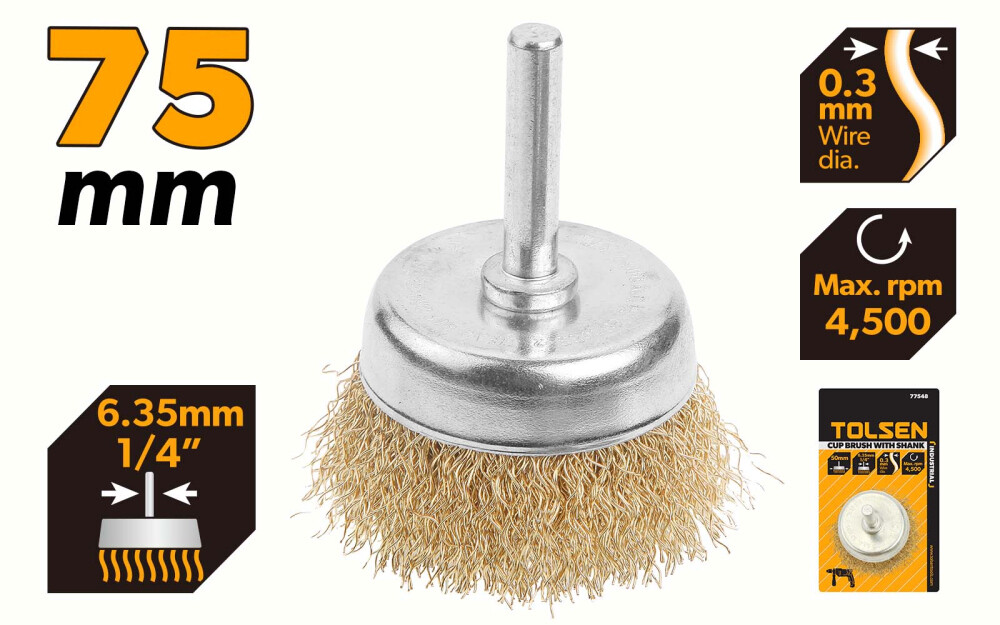 Aceasta perie tip cupa cu coada Tolsen este ideala pentru curatarea si slefuirea suprafetelor metalice. Diametrul sau de 75 mm si coada cu diametrul de 6.35mm (1/4'') o fac potrivita pentru utilizare pe diverse suprafete metalice, indiferent de dimensiunea acestora.