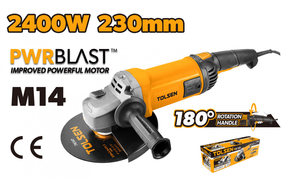 Aprobare CE Putere nominală: 2400W Tensiune: 230-240V Frecvență: 50/60Hz Viteză fără sarcină: 6500 rot/min Diametru disc: 230mm Ștecăr și cablu: aprobat CE, 2m Accesorii incluse: 1 pereche perii de carbon 1 mâner lateral 1 cheie fixă 1 cheie imbus 6mm Ambalare: cutie colorată