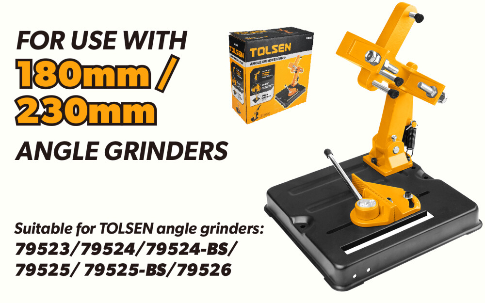 Standul pentru polizor unghiular de la Tolsen este un accesoriu util si practic pentru utilizarea cu polizoarele unghiulare de 180mm si 230mm. Standul este proiectat pentru a fi utilizat cu polizoarele unghiulare Tolsen 79523/79524/79524-BS/79525/79525-BS/79526.