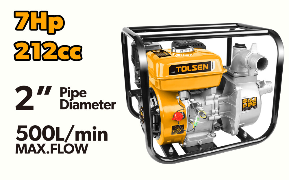 Această motopompă Tolsen este proiectată pentru a fi utilizată în aplicații industriale de pompare a apei. Motopompa are un diametru al orificiului de aspirație și de evacuare de 50mm (2"") și o deplasare de 212cc.
