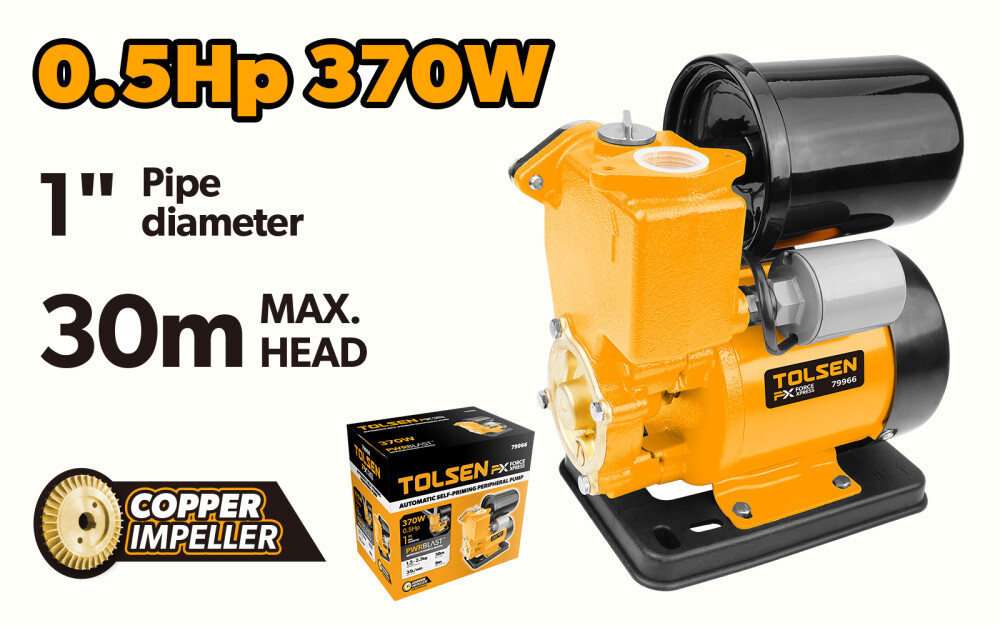 Această pompă periferică cu autoamorsare automată Tolsen este proiectată pentru a fi ușor de utilizat și de instalat. Pompă are o putere de intrare de 370W (0,5HP), o tensiune nominală de 230V și o frecvență nominală de 50Hz.
