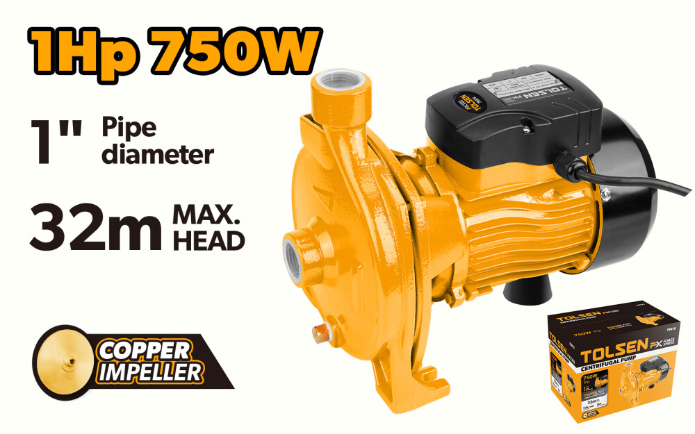 Această pompă de apă centrifugă de suprafață Tolsen este proiectată pentru a fi ușor de utilizat și de instalat în casa ta. Pompă are o putere de intrare de 750W (1HP), o tensiune nominală de 220-240V și o frecvență nominală de 50Hz.