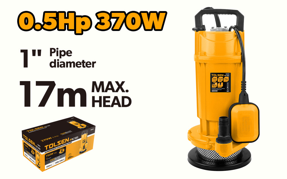 Această pompă submersibilă pentru apă curată Tolsen este proiectată pentru a fi ușor de utilizat și de instalat. Pompă are o putere de intrare de 370W (0,5HP), o tensiune nominală de 220-240V și o frecvență nominală de 50Hz.