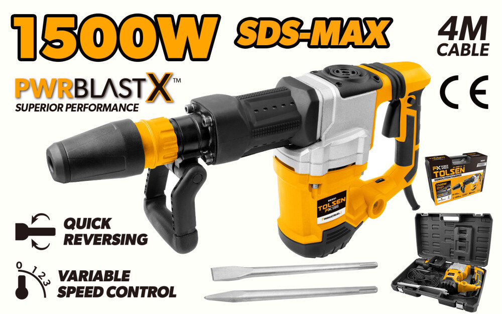 Cu Ciocanul demolator SDS MAX Tolsen vei simți forța Xpress și calitatea ca la Dewalt, într-un singur produs. Acest ciocan demolator industrial este perfect pentru demolarea rapidă și eficientă a zidăriei, betonului și a altor materiale de construcție.