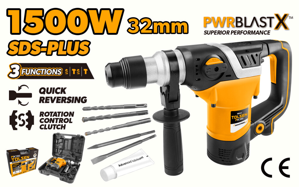 Cu ciocanul rotopercutor de la Tolsen, vei putea face cu usurinta gauri in beton, otel si lemn. Acest instrument puternic de 1500W vine cu o prindere SDS+ si o serie de accesorii incluse pentru a face sarcinile de gaurire si demolare mai usoare.