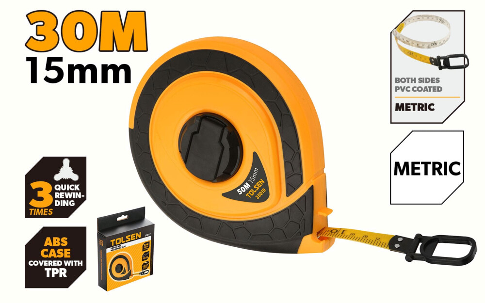 Descopera durabilitatea si precizia Ruletei Tolsen din Fibra de Sticla de 30m cu o latime de 15mm. Aceasta ruleta este special conceputa pentru a face fata celor mai dificile conditii de lucru intr-un mediu industrial.