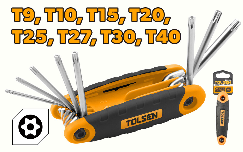Cheile cu torx pliabil Tolsen sunt dotate cu 8 dimensiuni diferite, de la T9 la T40, astfel incat sa fie utilizate pentru o gama larga de aplicatii. Design-ul pliabil al acestor chei face ca acestea sa fie usor de transportat si depozitat, fiind ideale pentru utilizatorii care doresc sa aiba instrumentele de mana la indemana oricand au nevoie de ele.