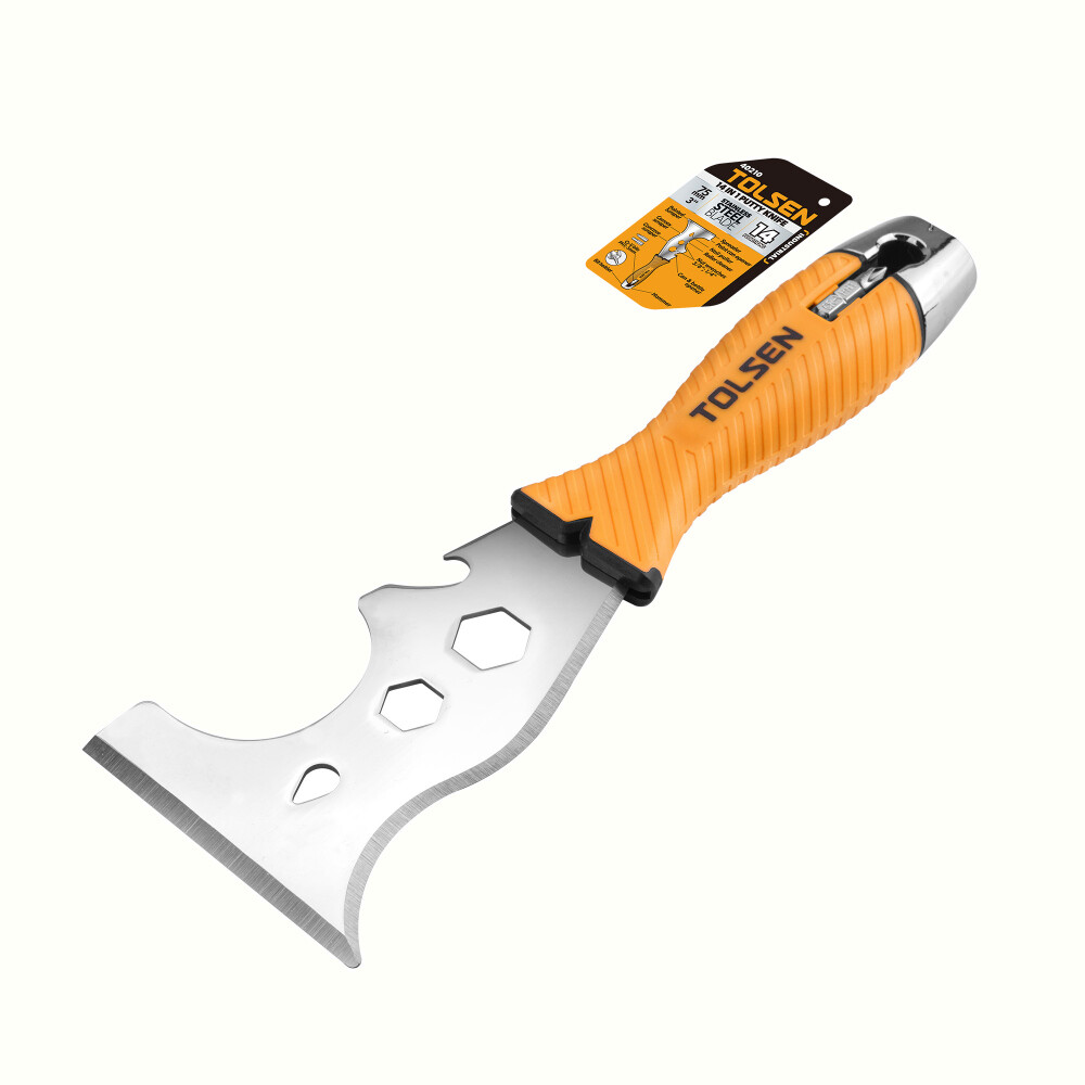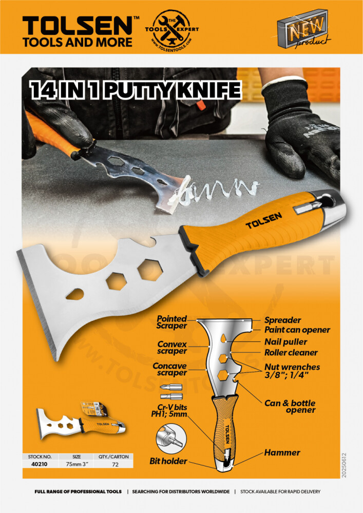 Stainless steel blade Lamă din oțel inoxidabil Luciu oglindă Lățime: 3" / 75 mm Mâner ergonomic Funcție: Cap ciocan cu suport pentru biți Biți Cr-V: PH1 + 5 mm Chei pentru piulițe 3/8" + 1/4" Racletă convexă Racletă concavă Deschizător de cutii de vopsea Racletă daltă Spreader Deschizător de crăpături Scule pentru scos cuie Curățător pentru role Deschizător de conserve