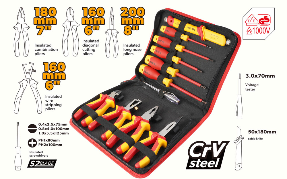 Acest set de 11 unelte de mână izolate de la Tolsen este un set complet pentru orice profesionist care lucrează cu componente electrice. Acesta conține unelte cu diferite funcții, fiecare având o utilitate specifică pentru a vă ajuta să realizați sarcinile de lucru cu precizie și siguranță. Uneltele sunt fabricate din materiale de calitate superioară și au o suprafață neagră finisată și polisată.