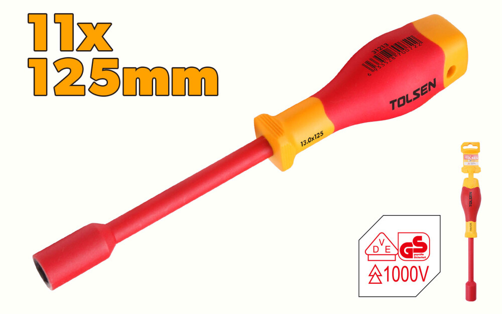 11*125 mm Certificată VDE/GS Cheie tubulară din crom-vanadiu, călit și detensionat în întregime Suprafață înnegrită chimic Mâner și manșon fabricate în conformitate cu EN60900 Formă ergonomică, pentru manevrare ușoară Cu orificiu pentru agățare O cutie interioară cu o agățătoare din plastic